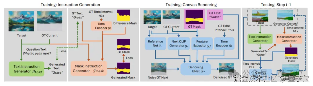 利用文本指令和区域掩码,以及当前画布的图像和目标画作,一个基于扩散的渲染器被用来更新画布。