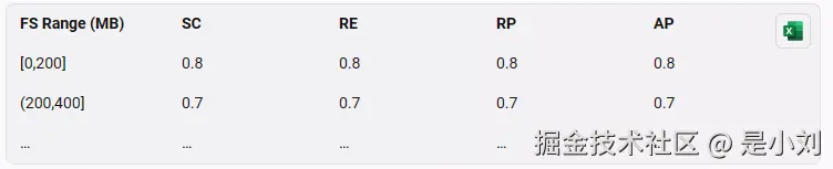 综合评分随着文件大小的增加而增加,随着k或m的增加而减少。这是因为,文件大小越大,各项性能指标越差;k或m越大,各项性能指标越好。我们选出了每个文件大小对应的最高评分作为其最佳参数,并得到了一张最低存储成本最高可靠性的file_size,k,m表。