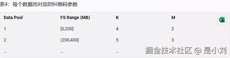 - 数据池4:文件大小为600MB-800MB,最佳纠删码参数为(15,14)。这个数据池适合存储一些超大型且不太重要的文件,例如备份、归档、日志等。这些文件占用的空间非常多,但是可以忽略故障。