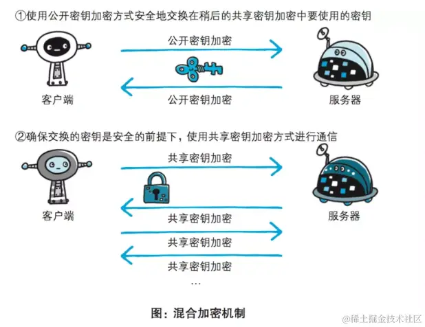 HTTPS 采⽤共享密钥加密(对称)和公开密钥加密(⾮对称)两者并⽤的混合加密机制。若密钥能够实现安全交换,那么有可能会考虑仅使⽤公开密钥加密来通信。但是公开密钥加密与共享密钥加密相⽐,其处理速度要慢。