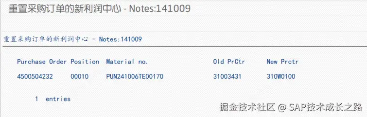 - 今后就可以通过 SE38 执行这段程序,在正式机中找出出错的采购订单号:4500504232,测试运行,发现确实是有一个条目是错误,取消勾选 TEST,重新执行,将错误的利润中心更改过来:
