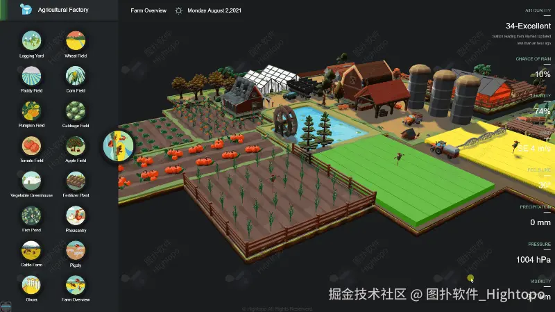 图扑软件曾搭建过 Low Poly 3D 轻量化风格的智慧农场可视化解决方案,实现对农业区域的网格化管理。Low Poly 3D 风格使得系统界面更加简洁、易于理解,同时具有出色的视觉表现力。