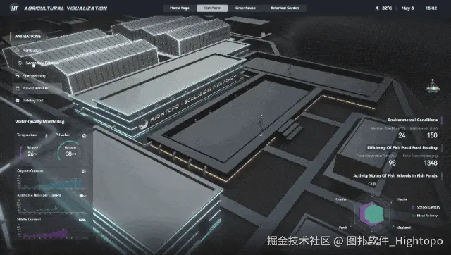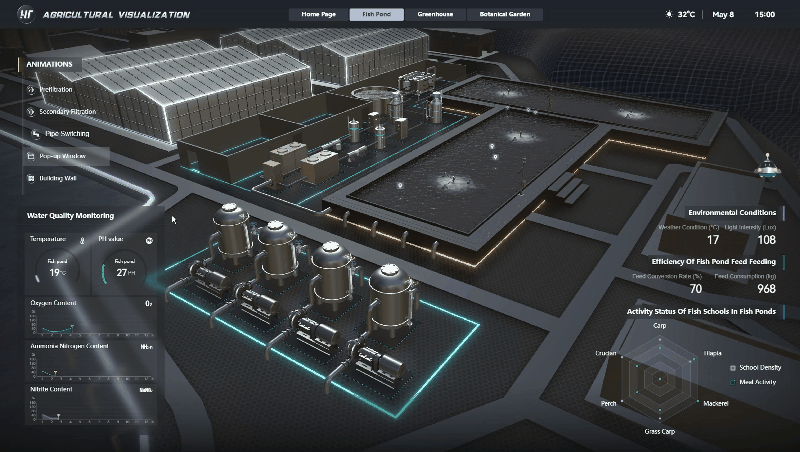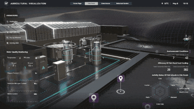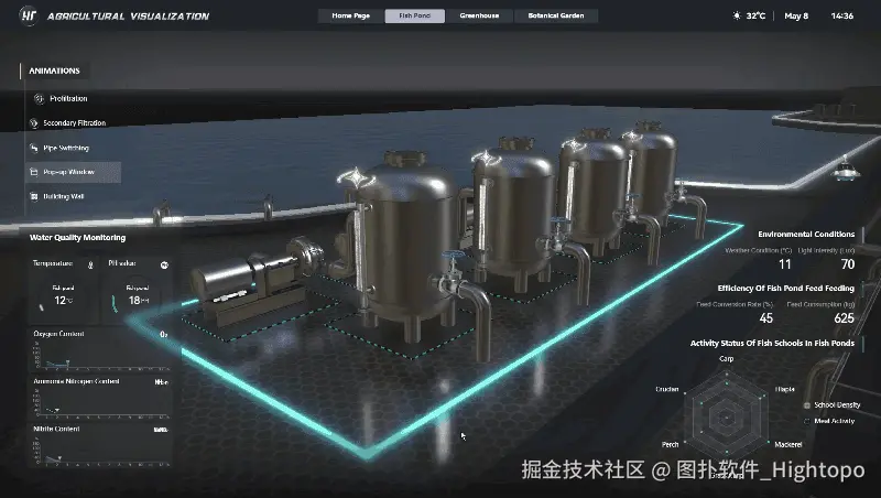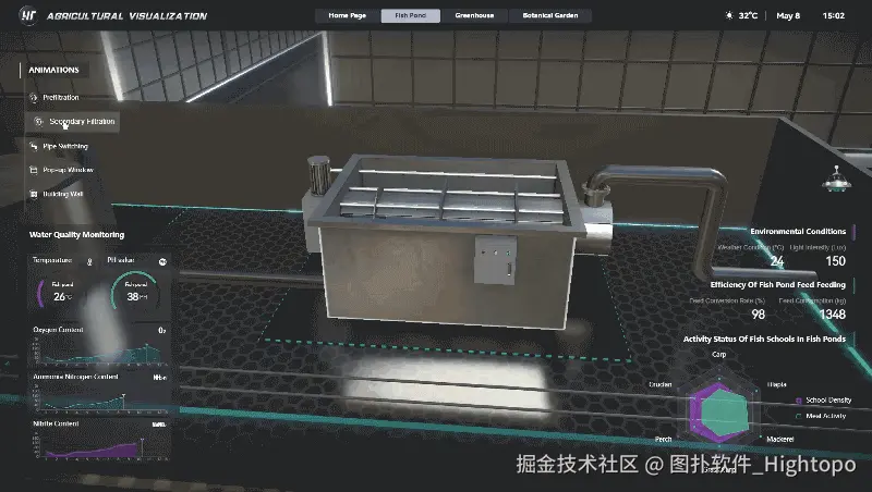 图扑 HT 生态鱼塘可视化系统,可实现对湖水采集、鱼塘生态监测、二次过滤系统等作业流程,进行智能化可视监控。帮助用户实时了解鱼塘内鱼群的总体健康状况,还能为饲料投放、水质管理等养殖决策提供数据支持,从而更有效地提高养殖效率和鱼类的生长健康状况。