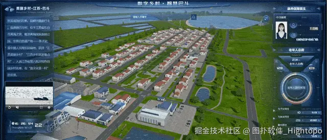 图扑 HT 通过构建乡村的虚拟模型,为农村的实物空间与数字空间融合提供技术基础。应用图扑软件 HT 强大的渲染引擎,1:1 建模还原乡村全貌,从数字安防、智慧康养、智慧旅游等方面,建立起具备场景化、智能化、人性化的智慧乡村综合管控平台。帮助乡镇提高农村的资源优化配置水平,减少农村管理的成本和困难。