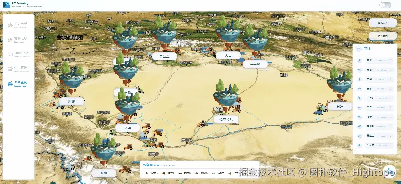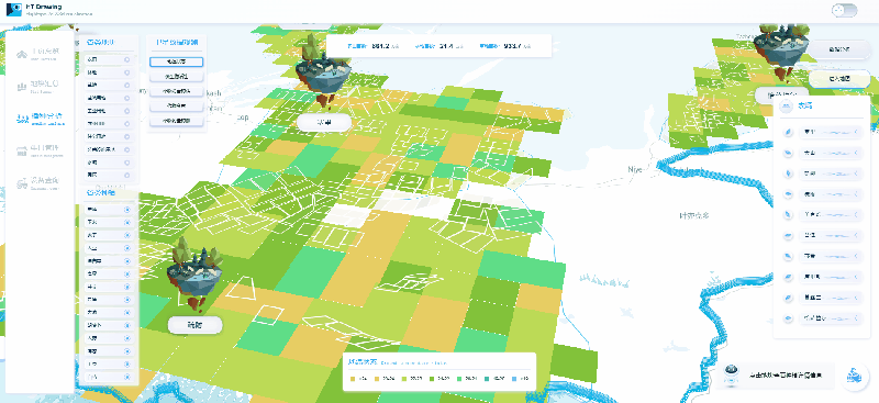 图扑软件的 HT for Web GIS 产品支持多种类型地图服务,以丰富的可视化形式将 GIS 数据进行展示和叠加,带来新的空间信息分析模式。结合 BIM 数据轻量化、三维视频融合等技术优势,在 GIS 系统中展示和分析海量 POI 数据、流量数据、规划数据等,为农林牧的经纬度、区域分布等信息提供直观准确的展示。