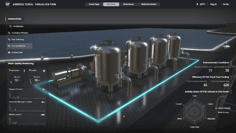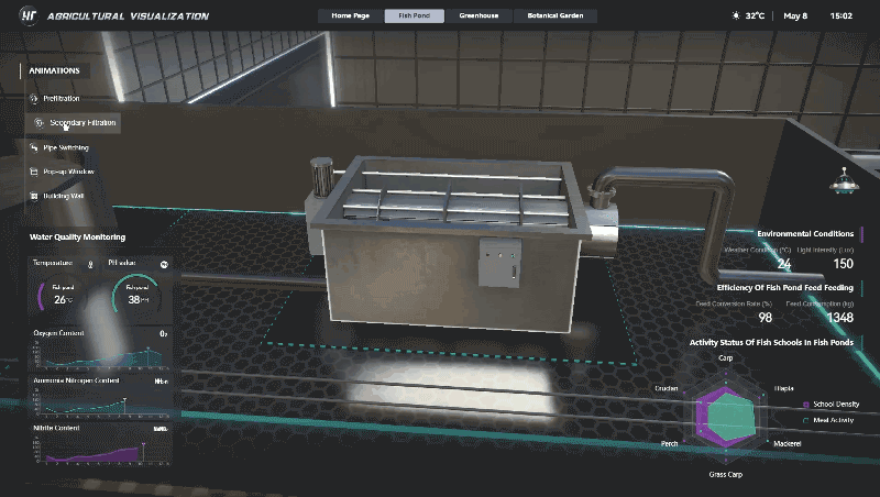 二次过滤系统可视化则是利用高效过滤技术对进出鱼塘的水进行二次过滤,确保其始终处于高效状态。系统还会将过滤效果和相关数据实时展示在可视化界面上,使养殖者能够直观地了解鱼塘的水质状况。