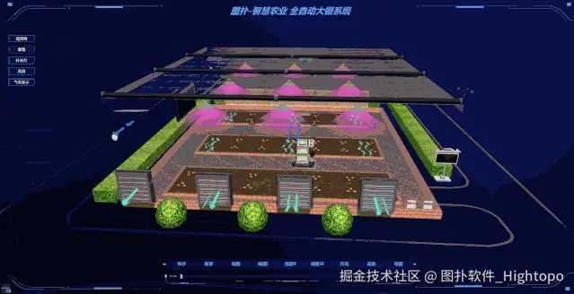 智慧大棚中,图扑 HT 模拟呈现温室大棚的实时环境。用户可以在智慧大棚中,控制遮阳网、灌溉、补光灯、气流显示、风扇的开启和关闭,同时模拟农作物的生长过程。