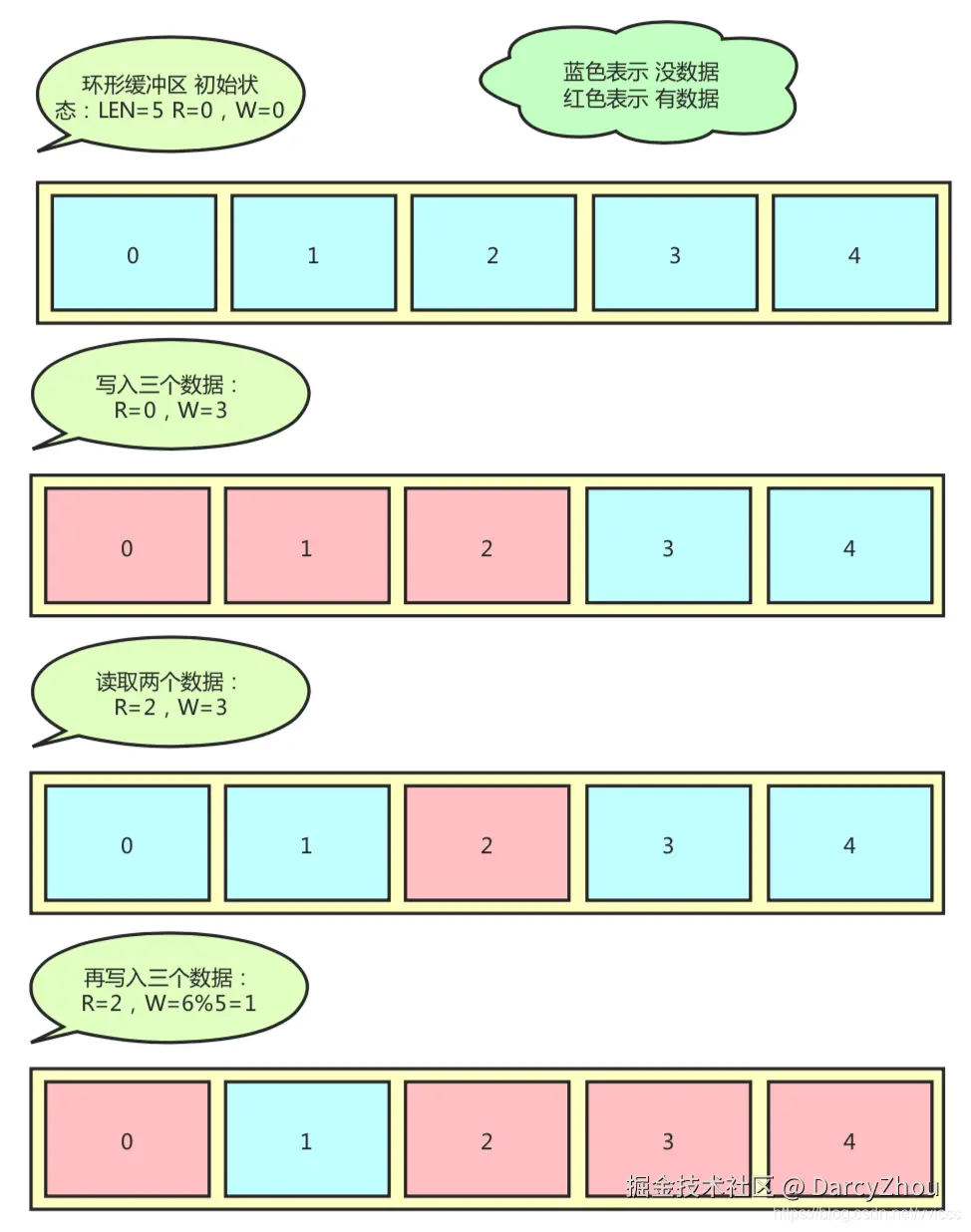 环形缓冲区:初始R=0,W=0,buf长度为LEN