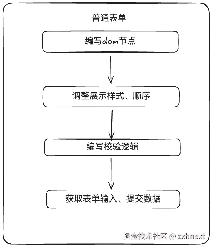 在需求量少或场景不复杂的情况下,这种开发模式尚可接受。然而,当项目中包含大量表单时,普通表单的开发方式因UI与业务逻辑过于耦合,导致后续的代码维护困难,影响可扩展性和可读性。此外,这种方式通常需要编写大量冗长且重复的代码,显著延长开发周期并增加维护成本。面对大量相似表单的构建,手动编写和维护的工作量和时间消耗尤为巨大。那么,有没有一种方法可以有效地分离业务逻辑与UI渲染逻辑,让我们专注于数据配置,避免繁琐的DOM样式编写与调整呢?基于此,我们想到了动态表单的设计思路。