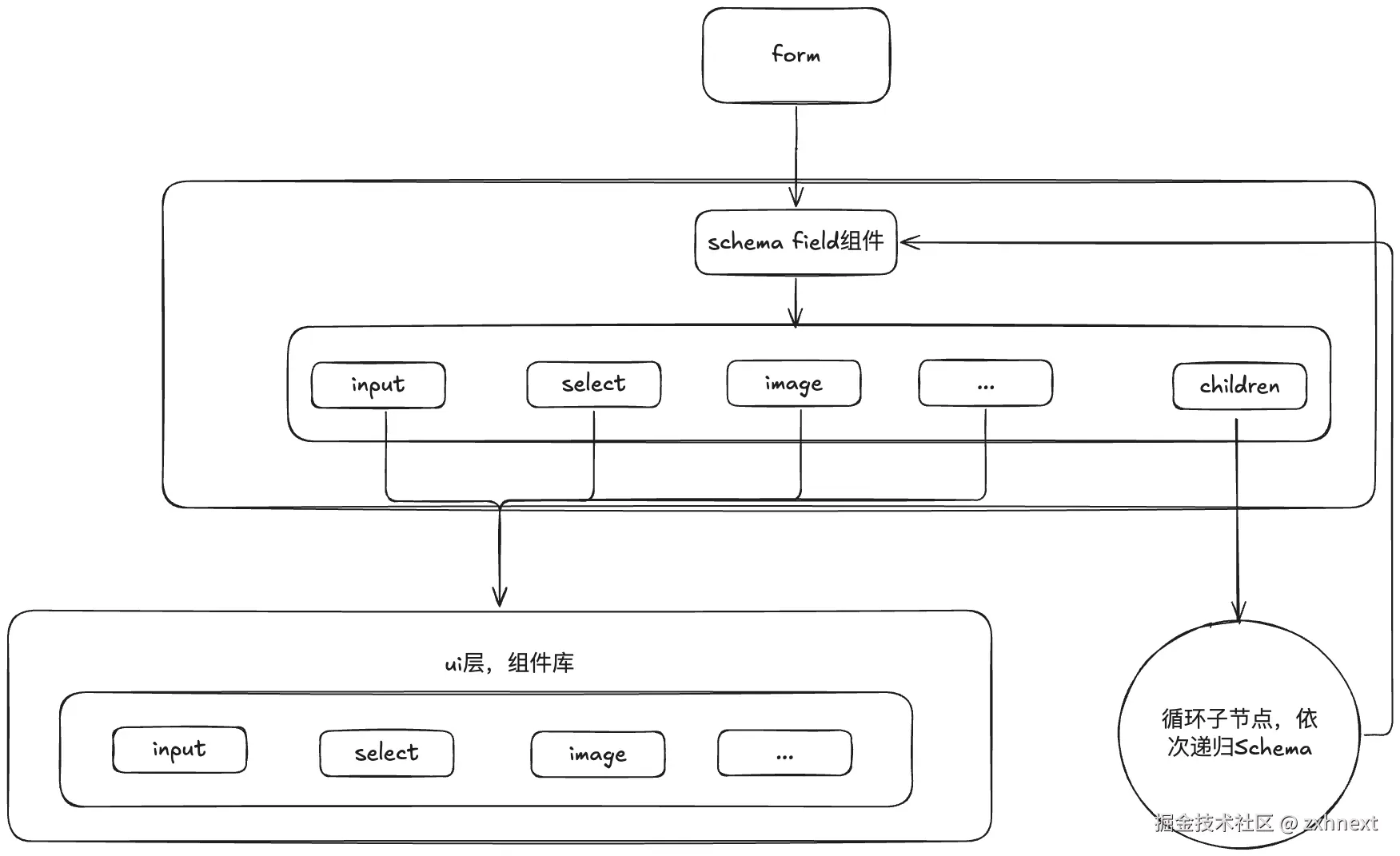 在这一阶段重点考虑将 Schema 转换为表单页面展示的问题,因为表单 Schema 主要由 JSON Schema 构成,因为它是一套递归的数据结构,所以 Schema 转换成真实渲染的表单实际上是一个组件逐级递归渲染的过程。