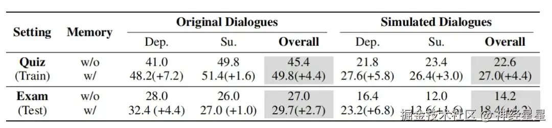 研究人员分别统计了在抑郁障碍和自杀倾向上的诊断准确率(类别均为无,轻度,中度,和重度)。通过比较加入层次结构的记忆和没有记忆的 AMC 系统,结果证明在测试集上模型的整体表现都有提升,验证了 AMC 在利用层次化记忆架构上的有效性,无论是单纯的诊断还是对话+诊断,都能有一定的提升。