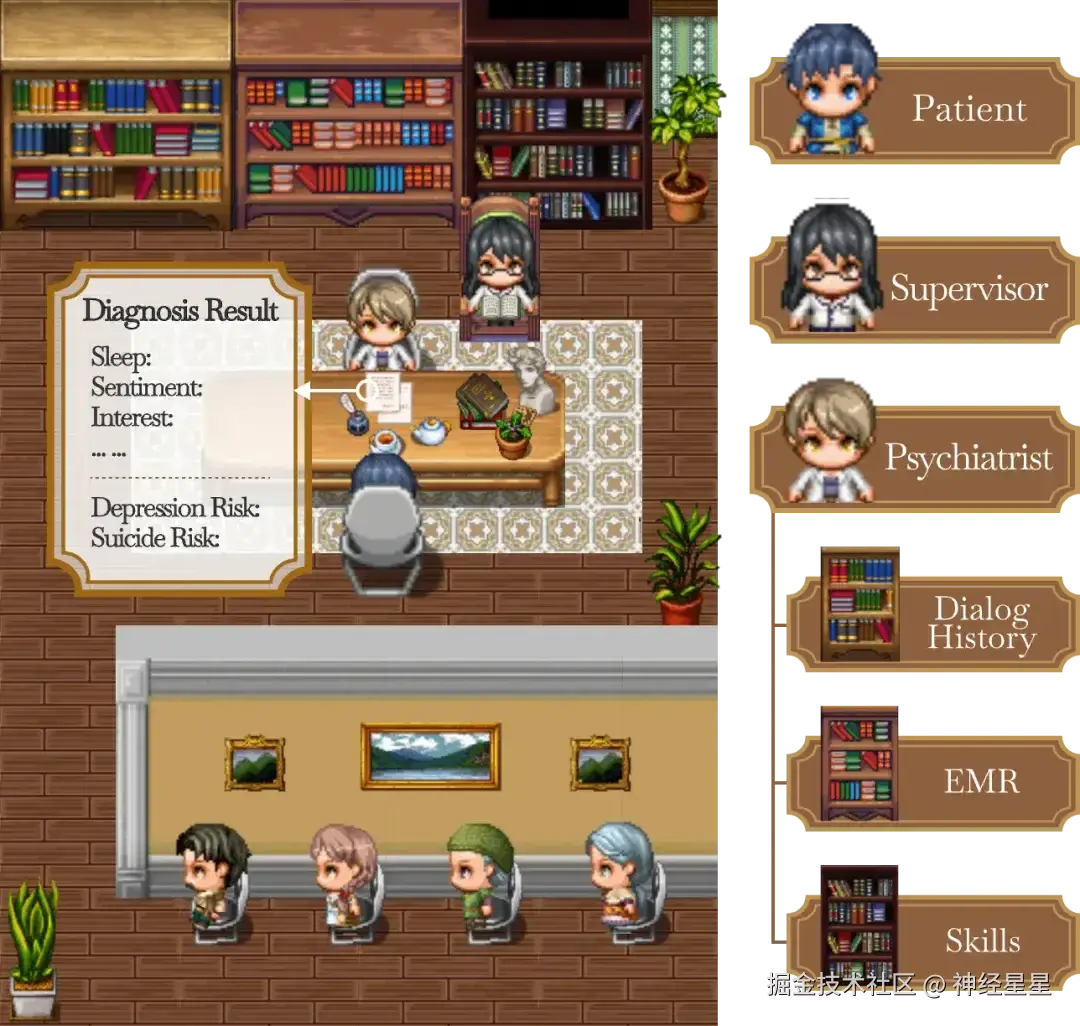搭建了一个新型的对话 Agent 模拟系统,模拟患者 Agent 和精神科医生 Agent 之间的诊断会话,为培训实习精神科医生和初步筛查潜在抑郁症患者提供了有效的新方法。