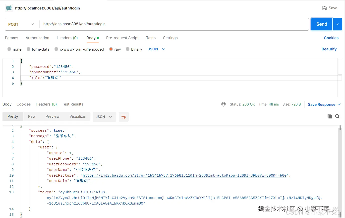 这里返回了对应的对象信息以及token,测试正确