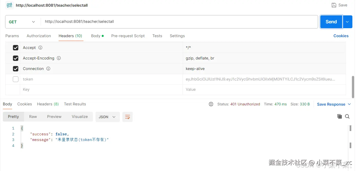 在postman中进行测试,当不携带token时查询信息,会显示为登录,无法获得信息