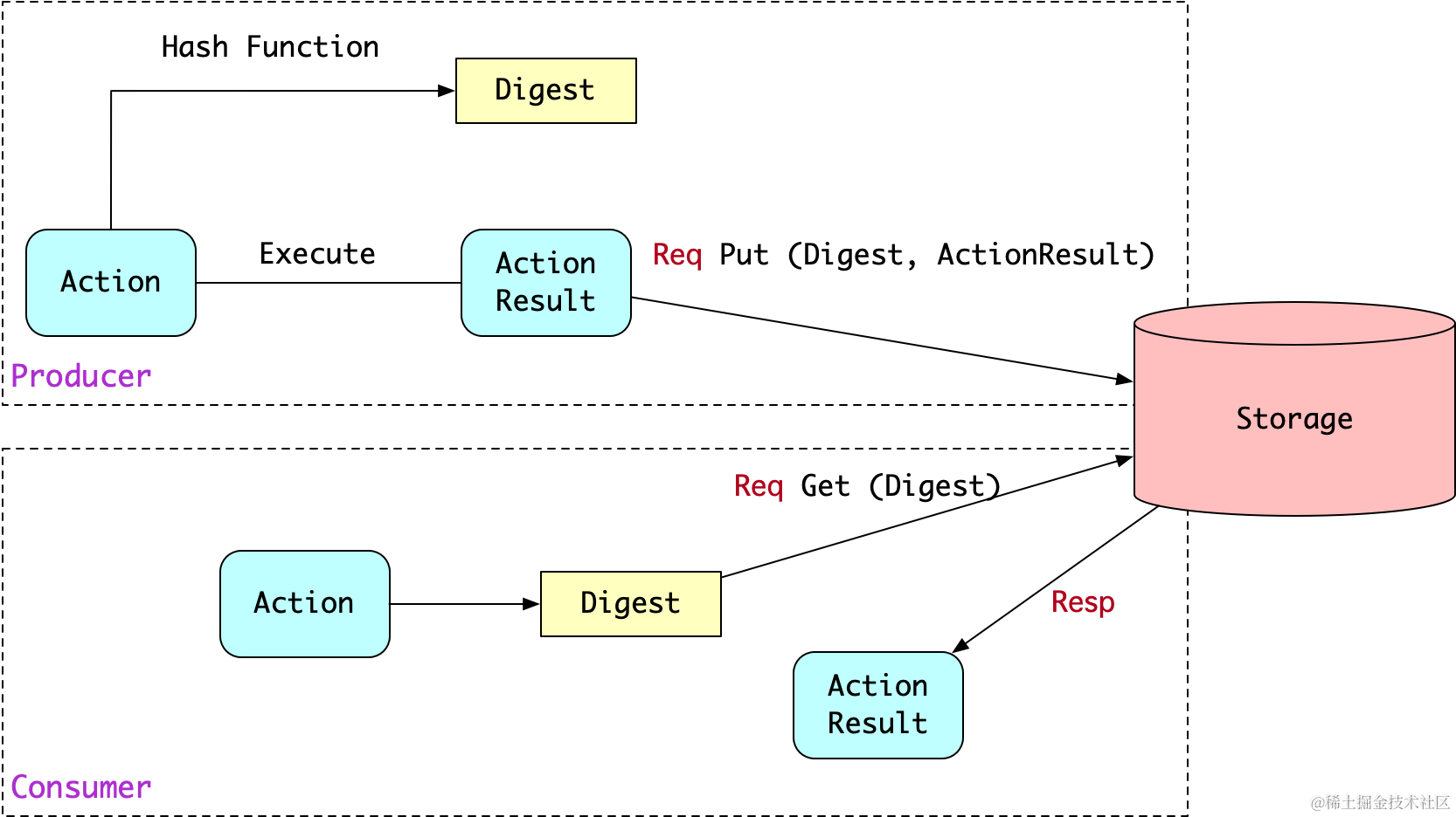 每个action的元数据和编译产物artifacts都会被hash为digest,这个digest是基于内容的,也就是说,只有内容发生变化时,才会重新计算digest。一个digest对应一个actionResult,内容寻址的好处是不容易污染存储空间。因此,通过remote cache我们可以持久化存储actionResult,从而加快编译构建。