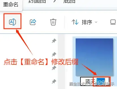 第一步:打开图片所在的文件夹,点击文件夹界面左上方的【重命名】图标(或者在选中图片之后单击图片)修改图片后缀名。