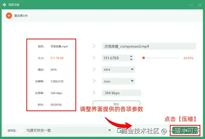 步骤3:进入到视频压缩界面,根据界面提供的各项参数,调整视频的大小、分辨率等参数,最后点击 【压缩】 即可。