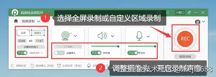 步骤3:即时进行的直播录屏,我们可在视频录制界面选择录制全屏或者自定义区域录制,并根据需要,对摄像头和声音等进行调整,然后点击 【REC】 录制按钮进行录屏。
