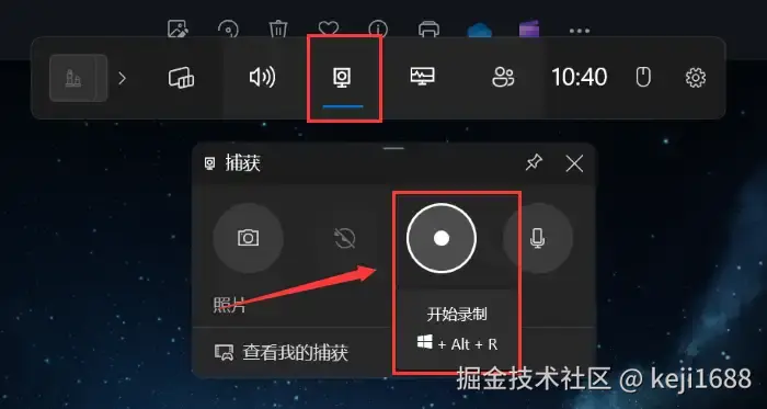 步骤2:在Xbox Game Bar中选择 【录制】 选项,点击 【圆形】 按钮进行录制,或者使用热键 【Win+Alt+R】 快速录制。