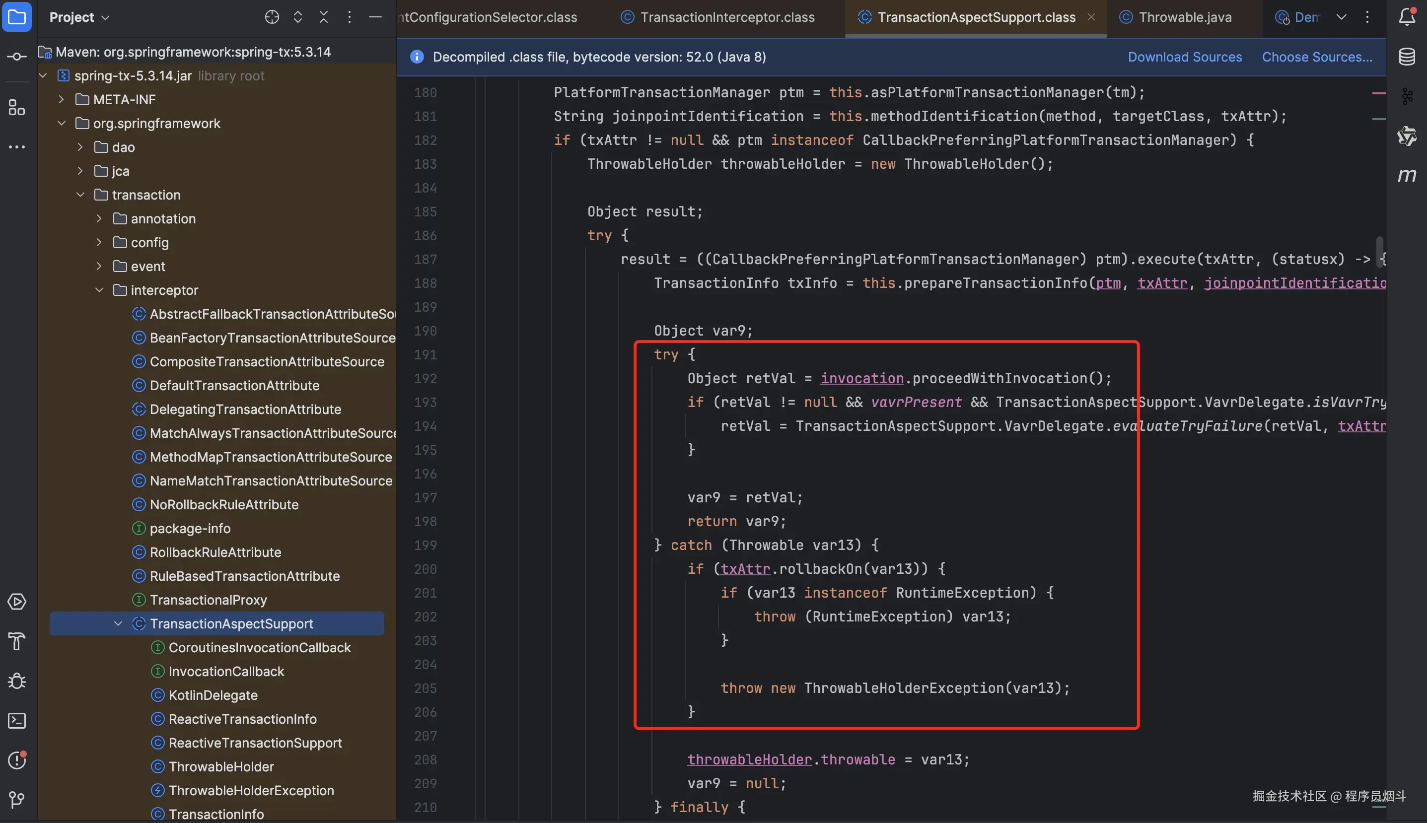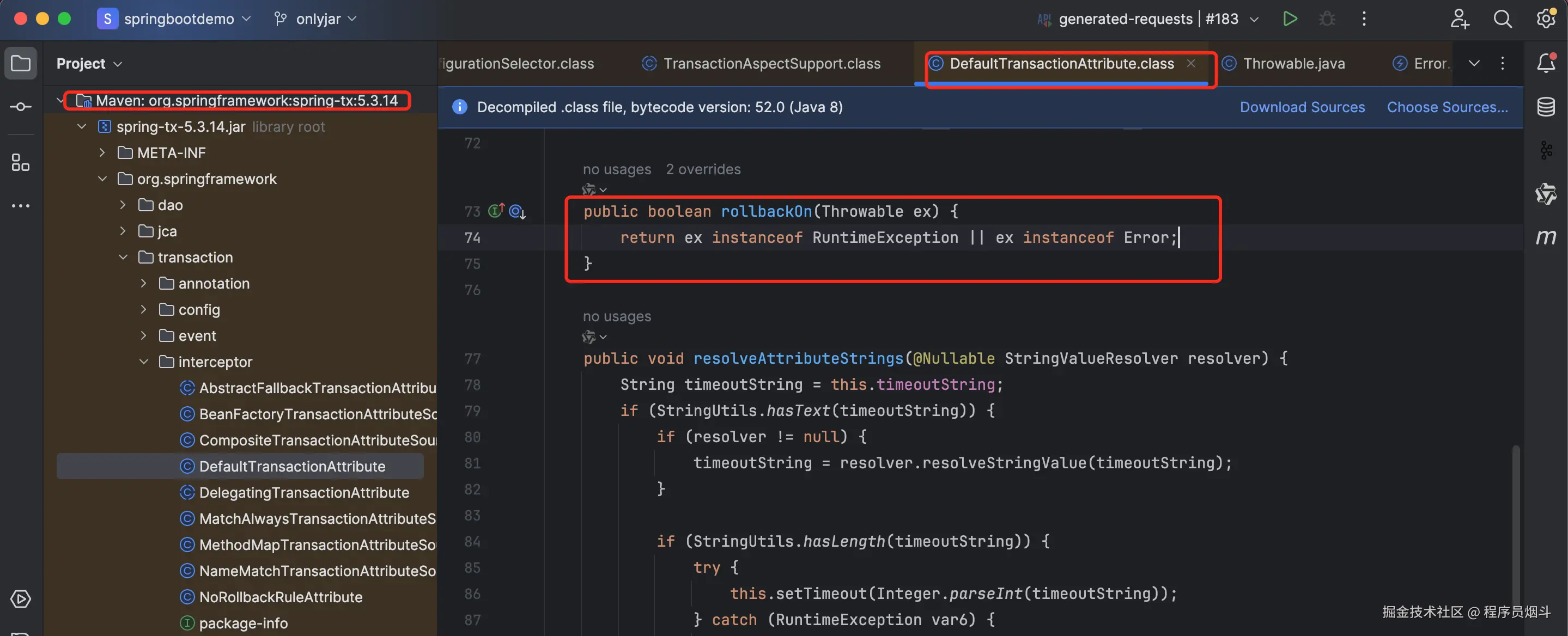 Spring事务默认会回滚RuntimeException 及其子类,以及 Error 类型的异常。如果是其余异常,则不会回滚。源码处可见: