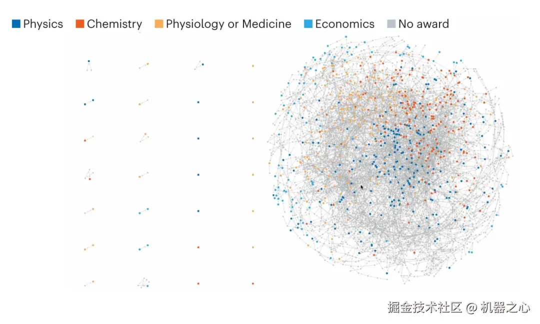 在更隐秘的角落,诺贝尔奖之上还笼罩着一层巨大而无形的「人情网」。Nature 的调查显示,无论看起来有多离谱,几乎所有诺贝尔奖得主都存在某种联系。令人惊讶的是,获得科学类以及经济学奖项中的 736 位得主,其中有 702 位属于同一个学术家族 —— 他们通过学术关系在历史的某个节点彼此相连。