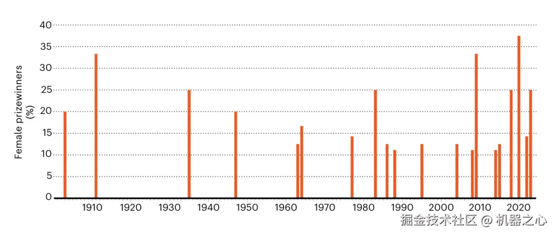 与此相对照的是,负责评选诺贝尔奖的组织表示过,他们正在积极努力提升诺贝尔奖得主的多样性,并且已经取得了显著进展。整个 20 世纪,诺贝尔化学奖、物理学奖以及生理学或医学奖仅有 11 次被授予女性;而在 2000 年至 2023 年间,这个数字就提升到了 15 次。