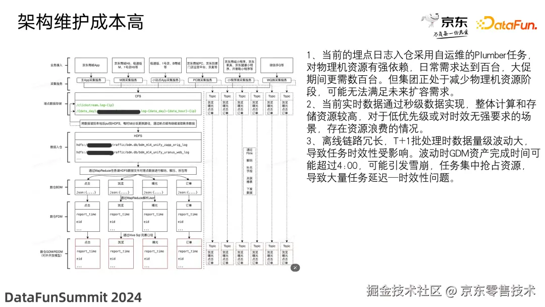 当前京东的数据处理架构分为离线处理和实时处理两条链路,离线处理的流程分为业务接入、采集服务、埋点数据存储、数据入仓、数仓 BDM 层、数仓 FDM 层、数仓 GDM 层等。实时处理的流程分为业务接入、采集服务、Kafka 缓存/Topic 划分、Flink 处理、Kafka 缓存/Topic 划分等。这样的架构存在着以下问题: