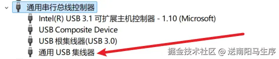 当我将一个 USB 一拖四扩展坞插入电脑时,多出了一个 “通用 USB” 集线器(集线器只能扩展接口,不能扩展带宽),如下图所示: