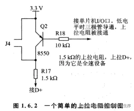如果 USB 外设或芯片没有内部 1.5k 上拉电阻,则可以通过以下电路实现: