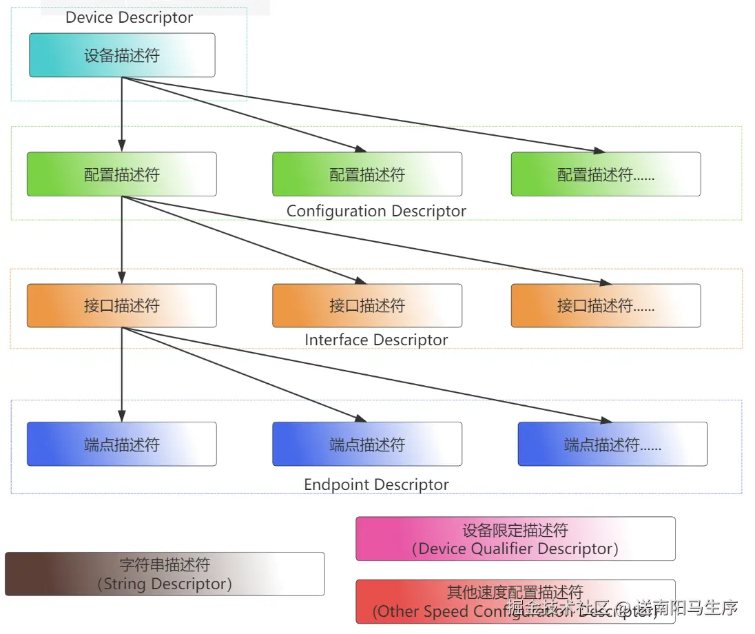 | 设备描述符 | 设备唯一,向主机说明设备类型、端点 0 最大包长、设备版本、配置数量等 |