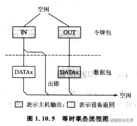 USB 协议规定 4 种传输类型:批量传输、等时(也作同步)传输、中断传输、控制传输。 控制传输包括 3 个过程,建立过程、状态过程分别是一个事务,数据过程则可能包含多个事务; 其余 3 种传输方式则每传输一次是一个事务。