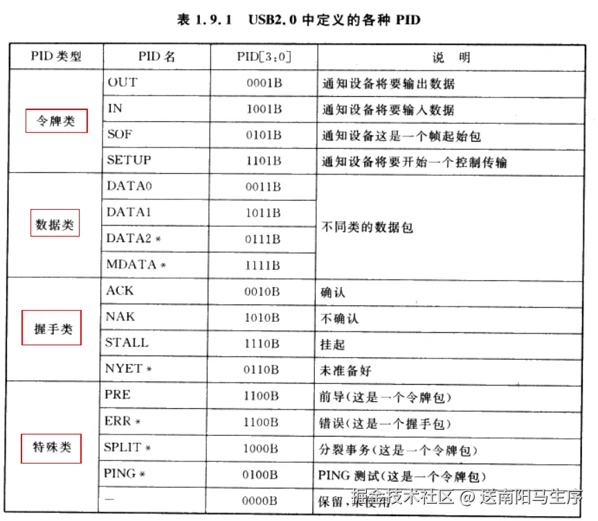 特殊包有 4 种,PRE、ERR、SPLIT、PING。其中除 ERR 是握手包外,其余均是令牌包且是 USB2.0新增。
