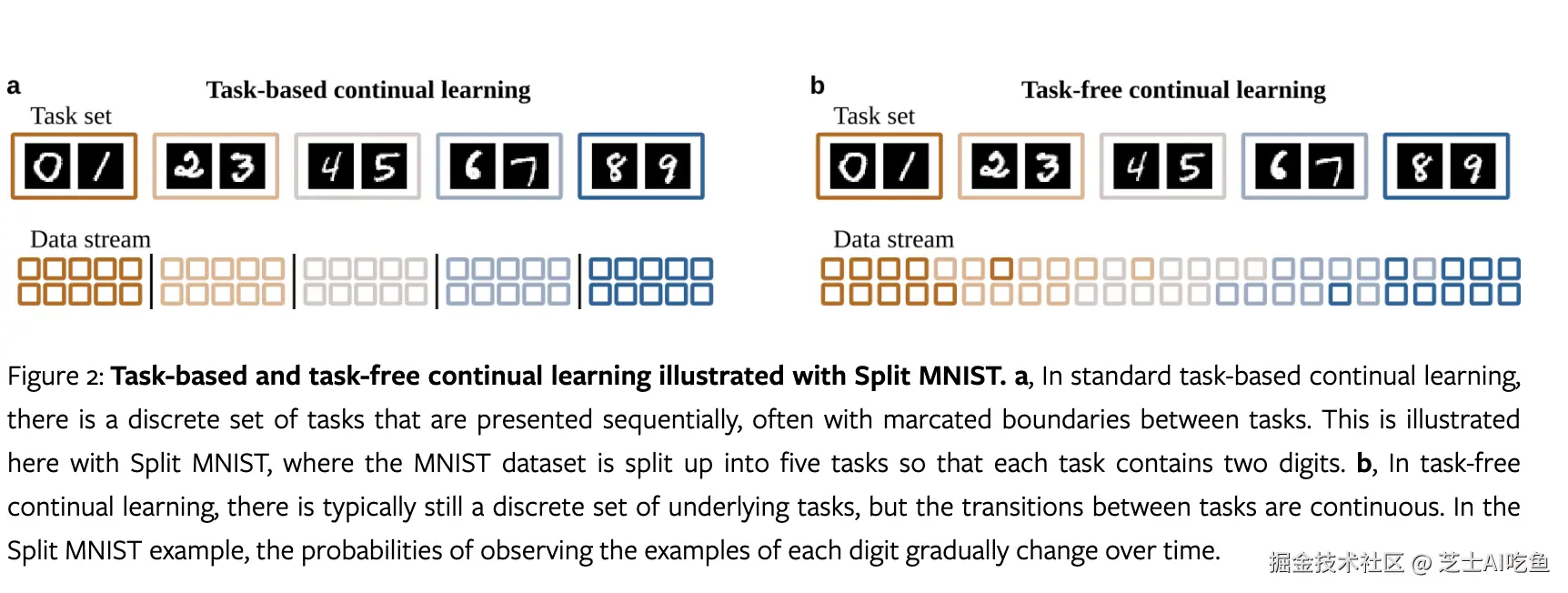 基于任务的持续学习假设存在一组离散的任务,而无任务持续学习允许任务之间的渐进过渡和任务重复。以下是一个简化的示例,展示了这两种方法的区别: