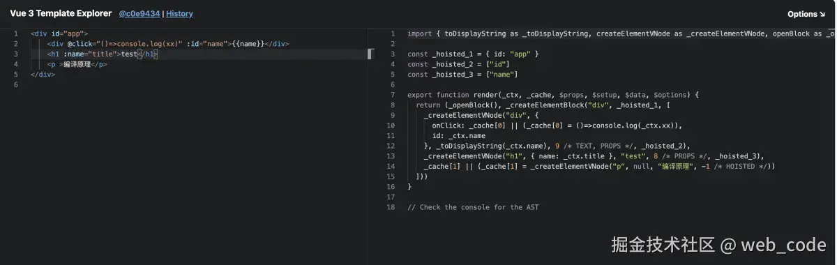 vue模板是怎么从template 编译成js代码(最后转换成render函数,生成VS DOM)的,根据官网例子,可以看到从模版编译到js代码的前后转变;Vue Template Explorer