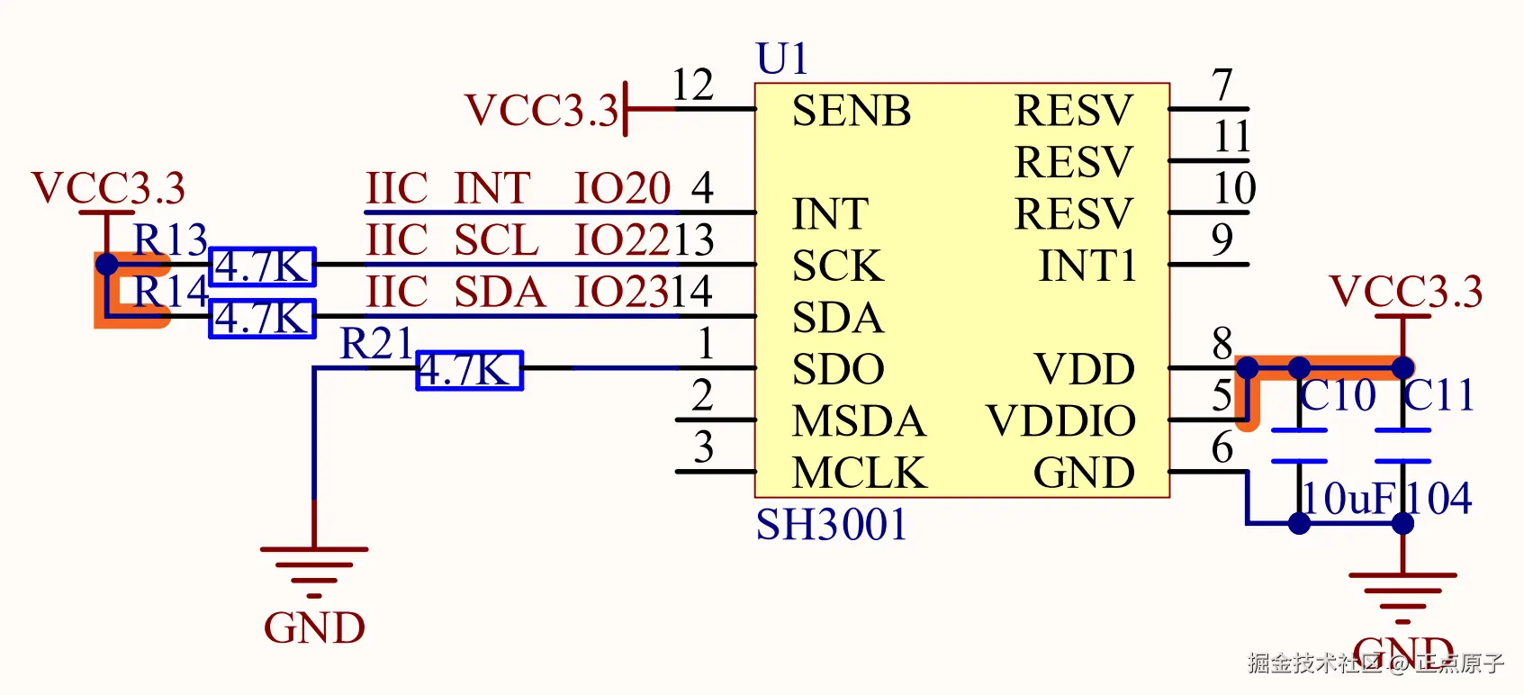 本章实验内容,需要通过I2C总线与板载的六轴传感器SH3001进行通讯,正点原子DNK210开发板上六轴传感器SH3001的连接原理图,如下图所示:
