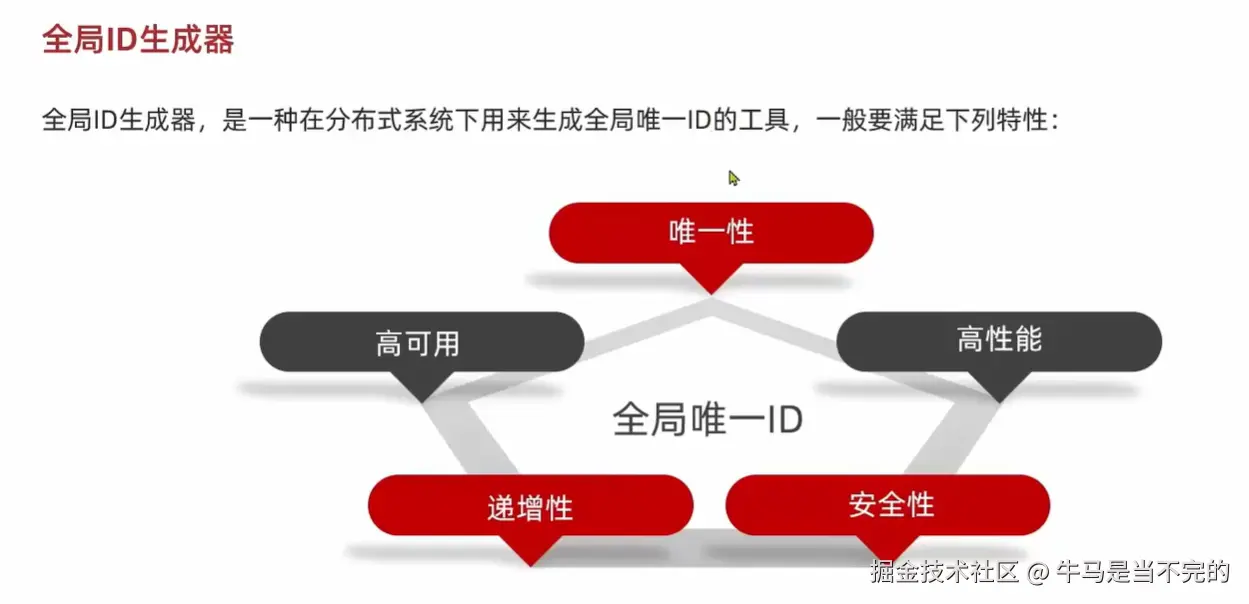 - 同时,当数据量大时,如订单数量随时间达到亿级别时,单张表无法存储这么大量的数据,需要分表,但如果分的每个表的id都是自增的,且各自计算自增,则不满足订单id的唯一性,无法达到业务需求