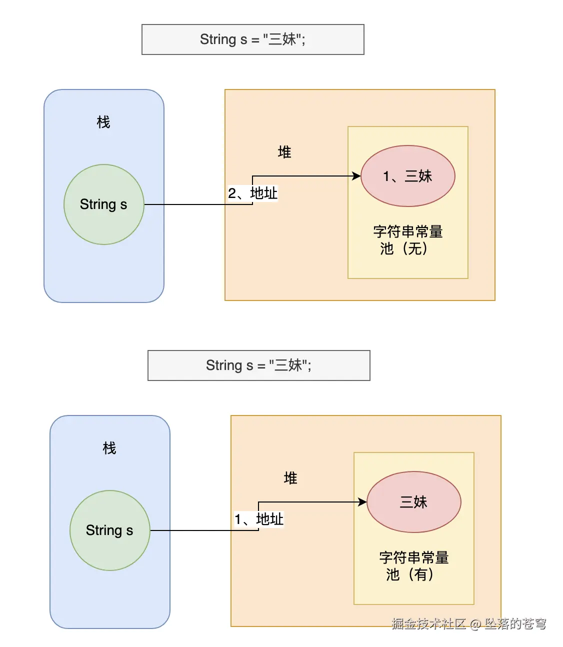 Java 虚拟机创建了一个字符串对象 "三妹",它被添加到了字符串常量池中,同时引用变量 s 存储在栈上,它指向字符串常量池中的字符串对象 "三妹"。你看,是不是省了一步,比之前高效了。