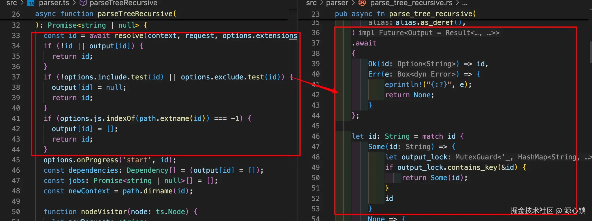 再看到 main 函数,可以找到核心逻辑是 parseDependencyTree 。再阅读后边的代码,后边的代码本质上都是在 tree 上读取数据进行数据分析,也就是说我们只要能保证我们的 rust 程序能生成出 99.99% 相似的 tree,那么就可以完成核心逻辑。
