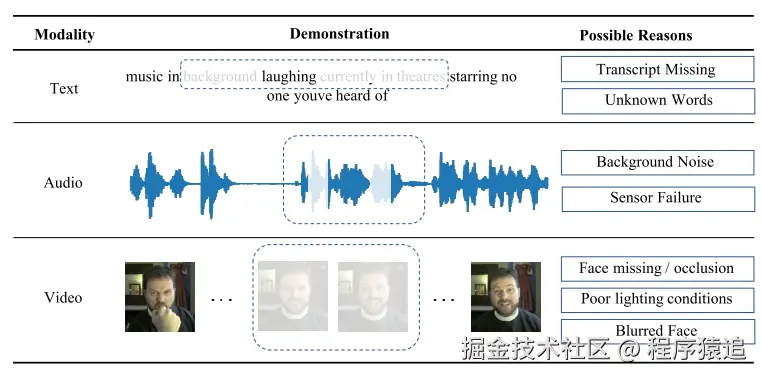随着用户生成的在线内容的丰富,各种多模态任务层出不穷。使用手动对齐的完整信息,包括转录语言,音频和视频,以前的工作已经取得了显着的改进多模态任务。然而,用户生成的视频通常是不完美的。首先,不同模态的接收器可能具有可变的接收频率,这导致不对齐的性质。其次,如下图所示,许多不可避免的因素,如用户生成的视频中的噪声或传感器故障,可能会导致模态特征提取器的故障。在这种情况下,需要一种能够处理随机模态特征缺失(RMFM)的模型。因此,在多模态任务中构建能够处理RMFM的模型仍然是一个开放的研究。基于RMFM的多模态任务的核心问题在于不完整模态序列的语义稀疏性,导致难以提取鲁棒的模态表示。据我所知,目前的工作大多直接使用具有缺失惩罚的不完整模态序列来学习联合融合表示。