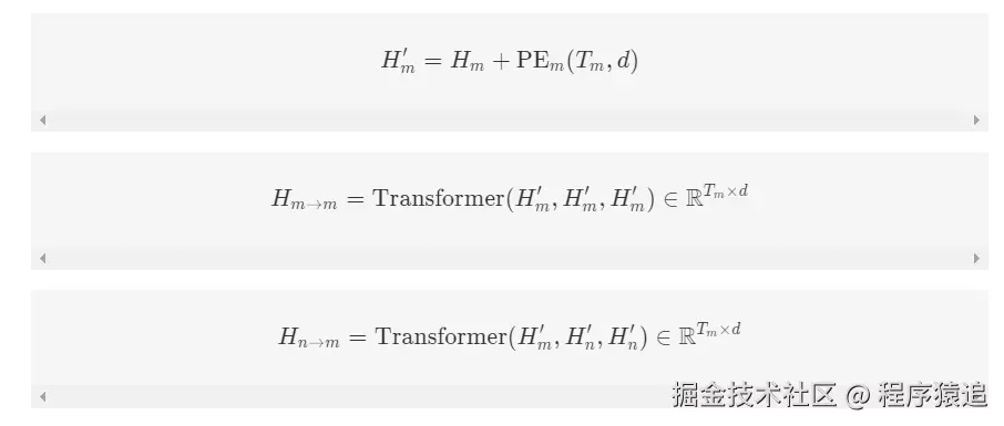 编辑其中,kmk**m 是模态 mm 的卷积核大小,dd 是公共维度。接下来,使用位置嵌入(Positional Embedding, PE)来增强卷积序列表示,然后通过模态内和模态间的 Transformer 来捕捉输入序列中每个时间步的模态动态。通过注意力机制,Transformer 能从一个序列块中提取另一个序列块的信息。用于这些变换的结构是 Transformer 编码器。在此过程中,HiH**i 的键、查询、值(key, query, value)都是 Transformer 编码器的输入。查询来自文本模态,而键和值可以从视觉或音频模态提取。因此,Transformer 编码器的表示可以写作:Transformer(query,key,value)Transformer(query,key,value)。