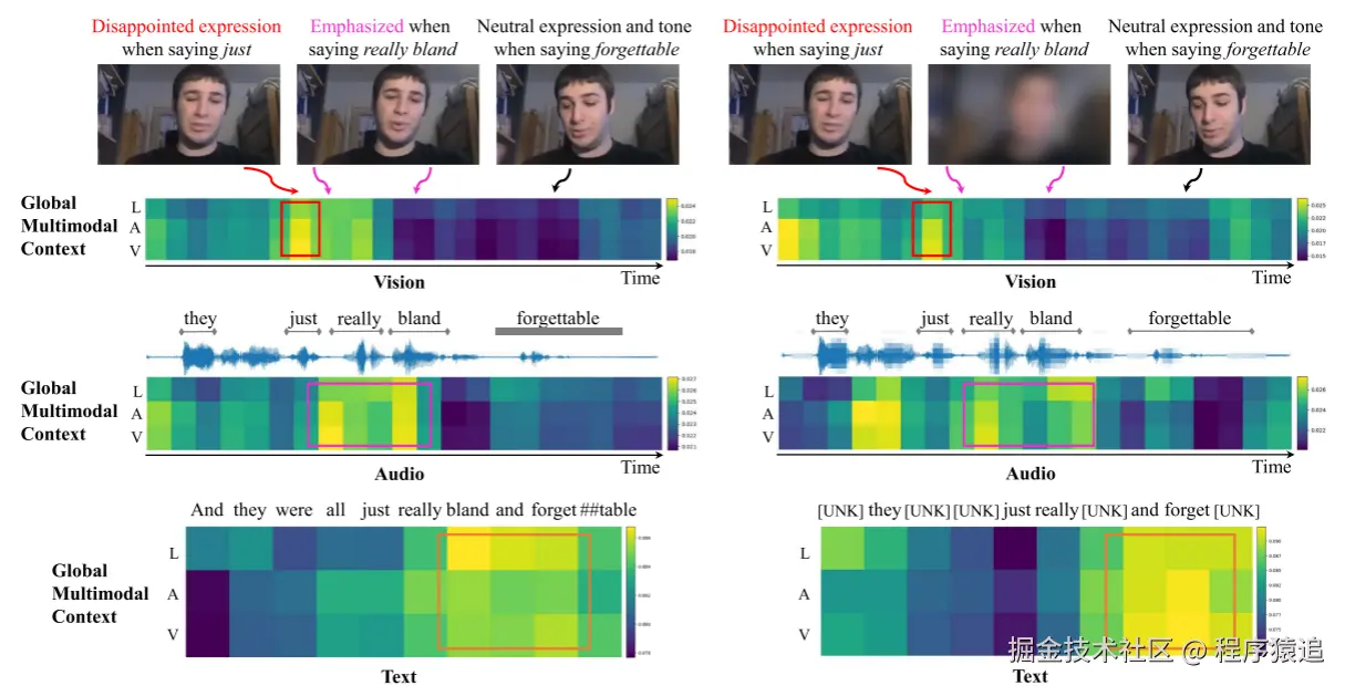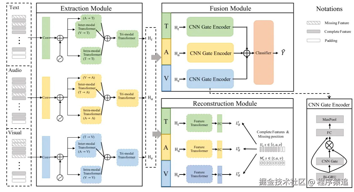 编辑其中,m∈{t,a,v}m∈{t,a,v},n1n1 和 n2n2 表示除 mm 之外的其他两种模态。增强后的序列有望利用模态间的互补性,为缺失的模态特征提取有效的表示。此外,这种包含跨模态交互的增强模态序列可以被视为模型级融合结果。
