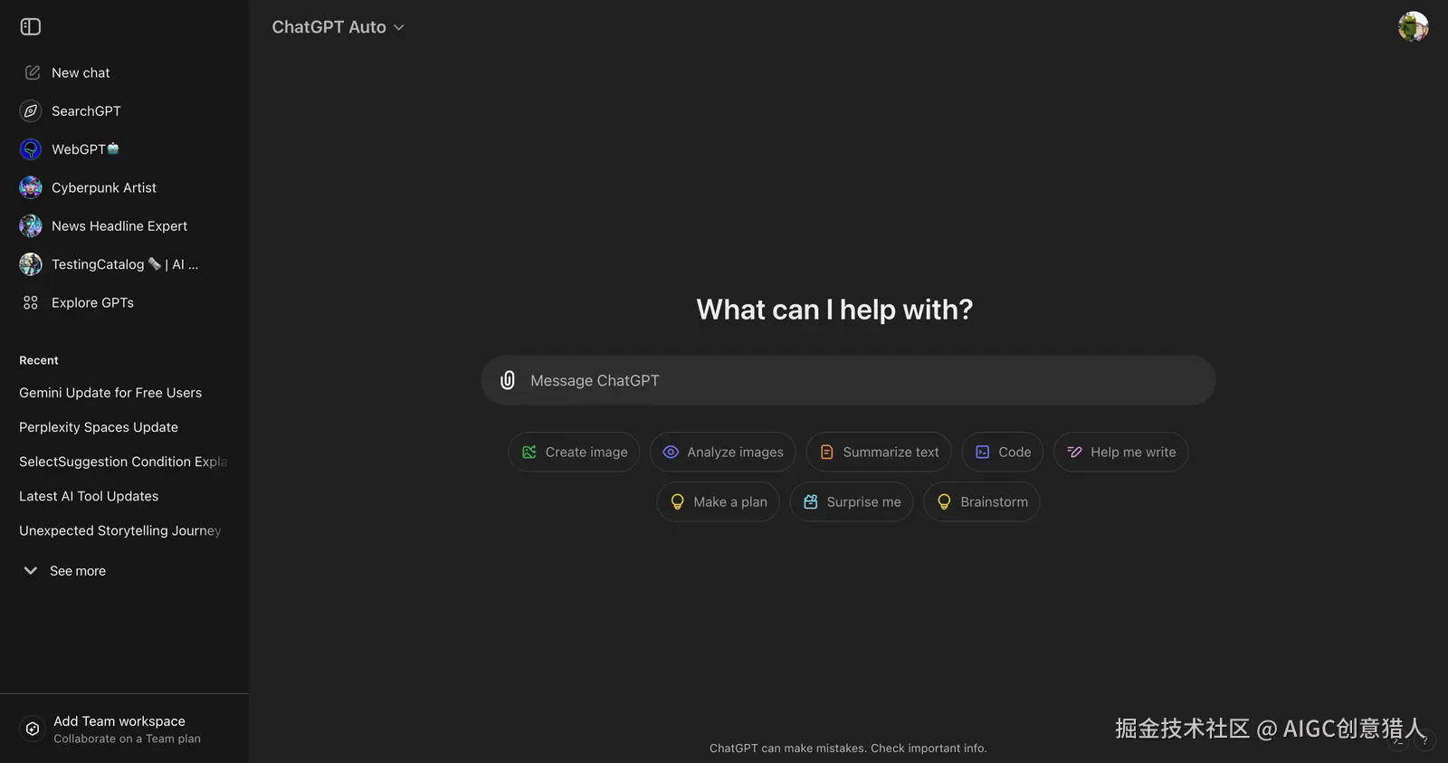 ChatGPT的新主页设计简洁大方,中央的搜索或提示栏取代了之前复杂的界面,给人一种焕然一新的感觉。这个设计让人不禁联想到SearchGPT,用户可以通过这个提示栏直接输入问题或需求,系统会智能地给出更具针对性的提示建议。这些建议被分类为不同的选项,方便用户选择更合适的方向。这意味着,在日常使用过程中,用户将能够更快地找到自己想要的功能或服务,操作体验更加人性化和高效。