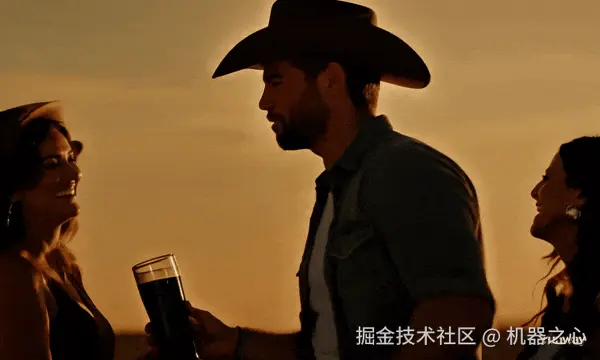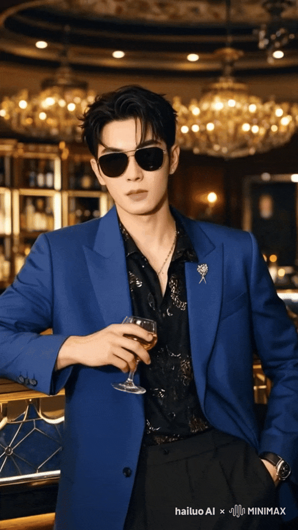 我们还上传了一张戴着墨镜、身穿西装、端着酒杯的男模特图片,然后输入 Prompt:男人开心地举起酒杯,然后从画面左侧走出来一位美女。
