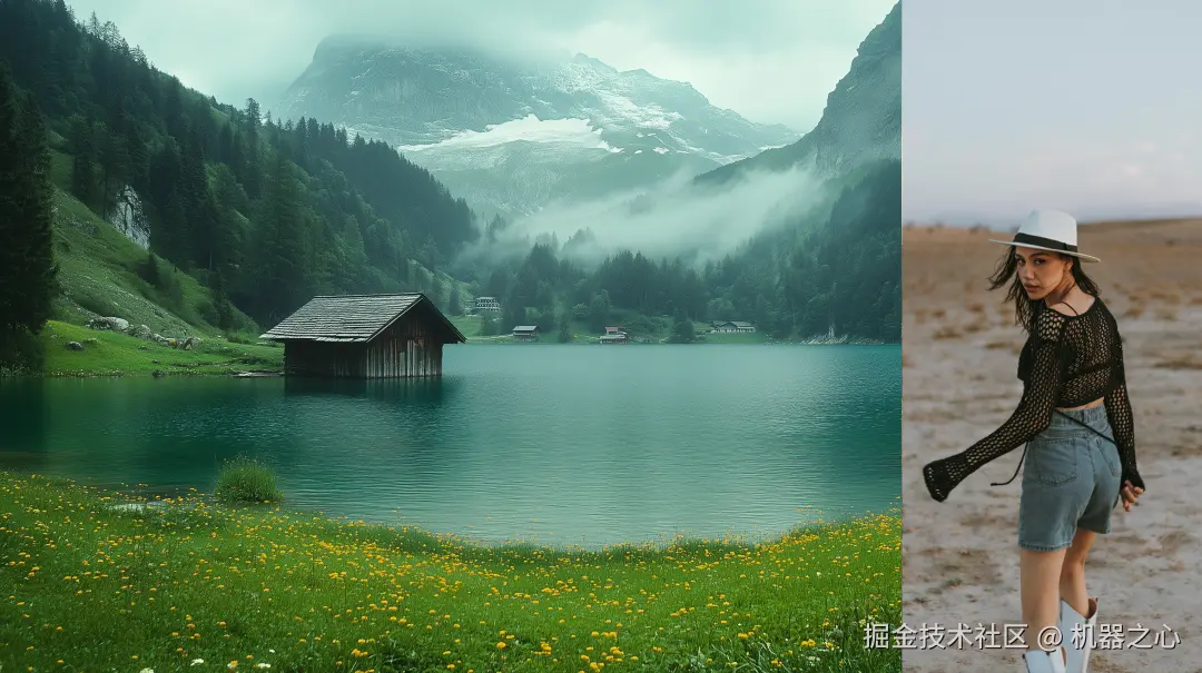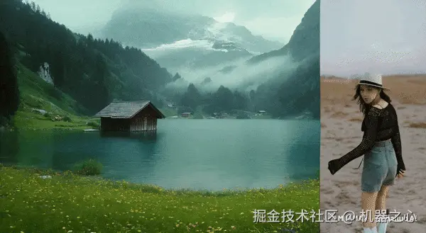 例如,将一位美女的照片和一幅风景图拼在一起,然后输入 prompt:女子走向绿地,站在草地上,望着美丽的湖面,镜头缓缓左移。