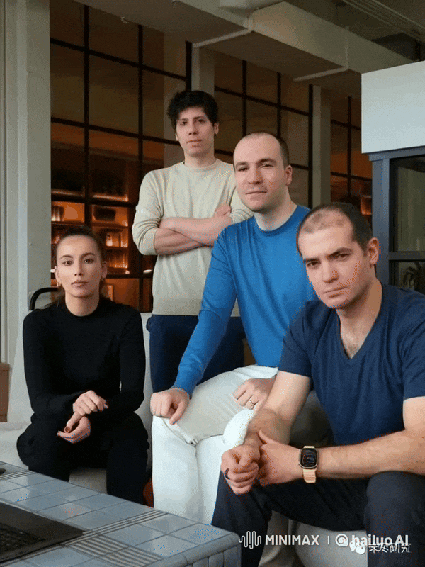海螺 AI 严格遵循提示词,坐在沙发上的 Ilya、Greg、Murati 站起来,向左走出画面,独留 Altman 站在原地凌乱;而 Runway 生成的画面则崩得离谱,照片中的四个人飞出沙发,完全没有遵循物理世界的运动规律,甚至还出现了脑袋 360 度旋转的诡异画面。