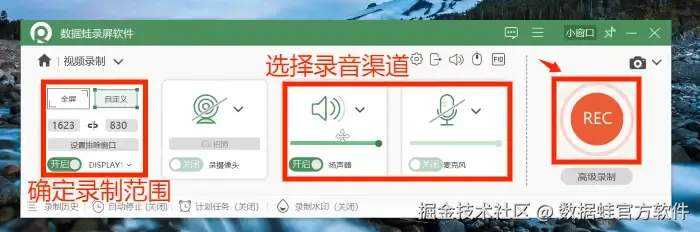 步骤3: 自由确定录制范围,可以选择设置音频源,如系统声音或麦克风输入。随后点击 “REC” 按钮,就可轻松开始视频录制。