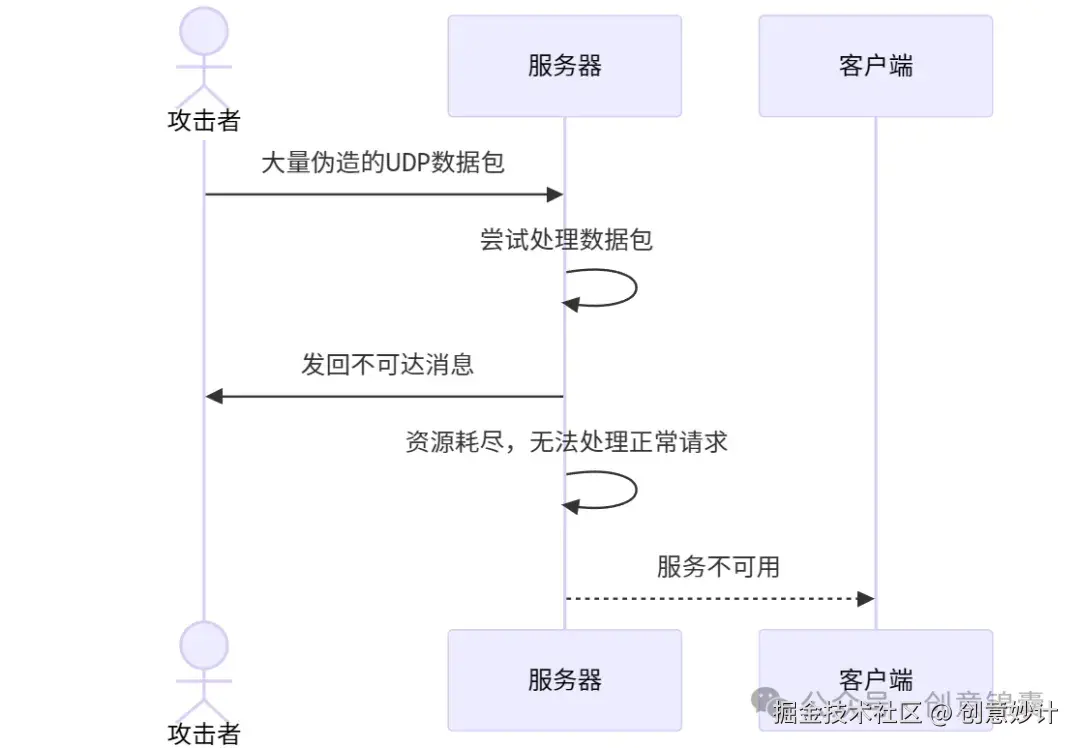- 发送大量UDP数据包:攻击者向目标服务器的随机端口发送这些数据包,服务器需要检查每个端口是否在监听对应的服务,如果没有,它会发回一个“不可达”消息。
