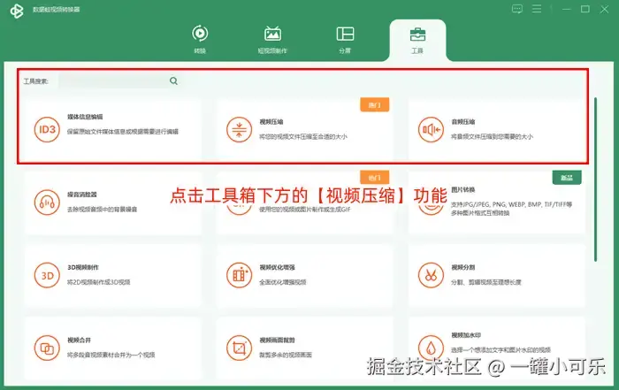 步骤1:打开该应用,点击工具箱下方的 【视频压缩】 功能并进入添加文件界面。