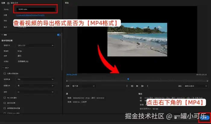 步骤2:点击导出,查看视频的导出格式是否为【MP4格式】,确认后点击右下角的【MP4】即可。