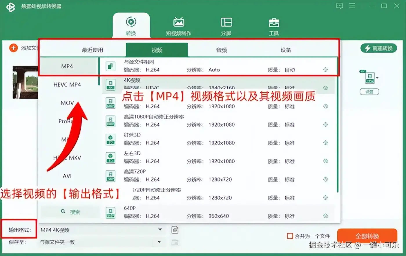 步骤2:选择视频的 【输出格式】 ,点击【MP4】视频格式以及其视频画质。